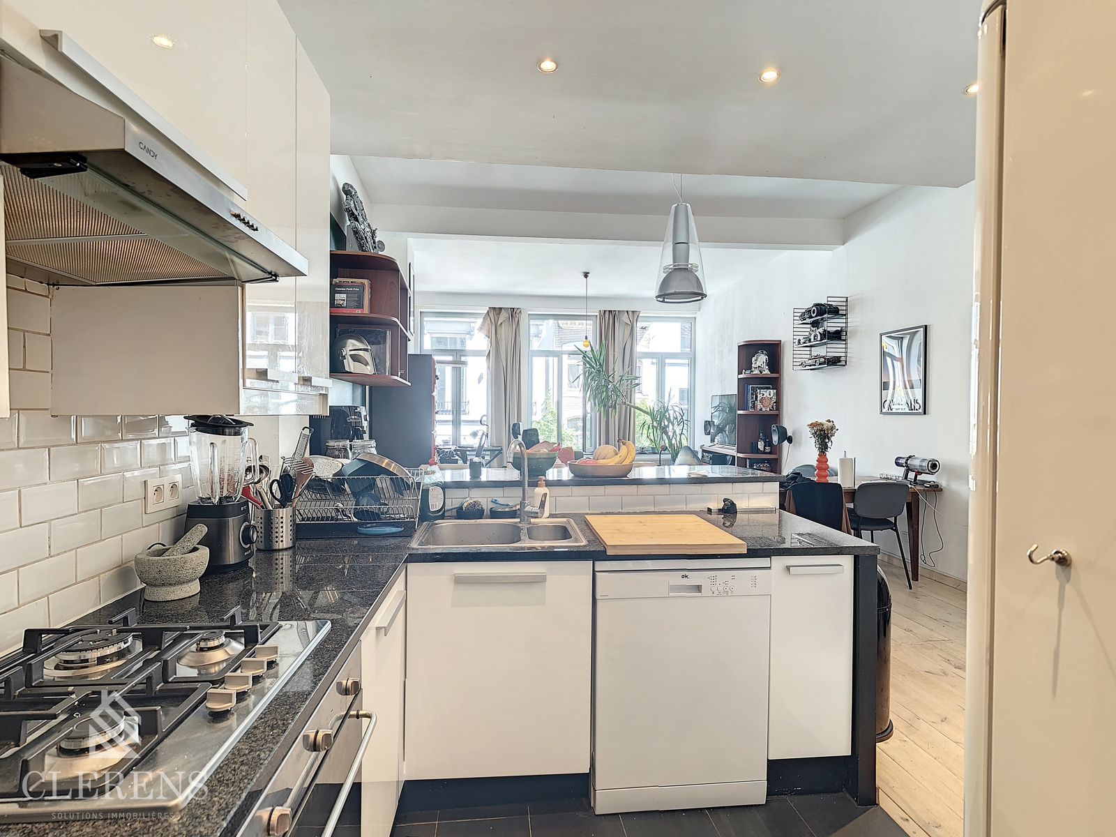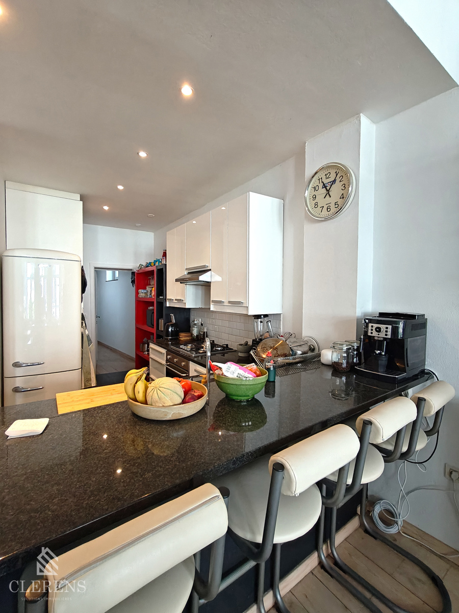CENTRE-VILLE – DANSAERT, dans la célèbre Rue de Flandre, rue à circulation locale, dans un immeuble datant du début du XXème, au 1er étage sur 3 avec ascenseur, un lumineux appartement coup de coeur de 100m² habitables comprenant : un hall d’entrée avec porte blindée, lumineux séjour/salle à manger de 32m², belle cuisine super-équipée ouverte (frigo, congélateur, lave-vaisselle, four, taques au gaz et espace buanderie) avec coin à déjeuner/bar, hall de nuit avec WC séparé, une salle de bain avec une douche et un bain, une chambre de 13,5m² et une seconde chambre de 10m². PEB C- ! P.I : 716€
